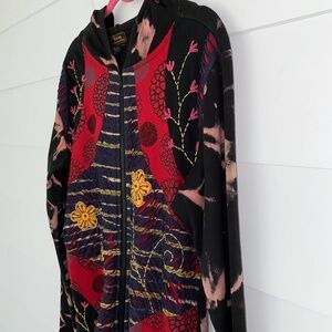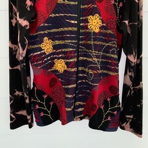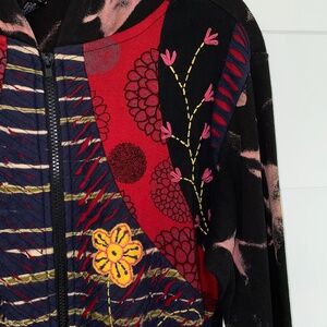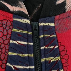 - Zip front, hood, side pockets, unlined, embroidery, mixed prints