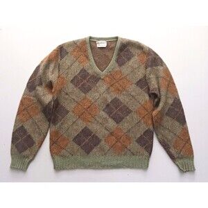 VTG Rob Scot Mohair Blend V Neck Sweater Olive Green/Brown Argyle Mens S