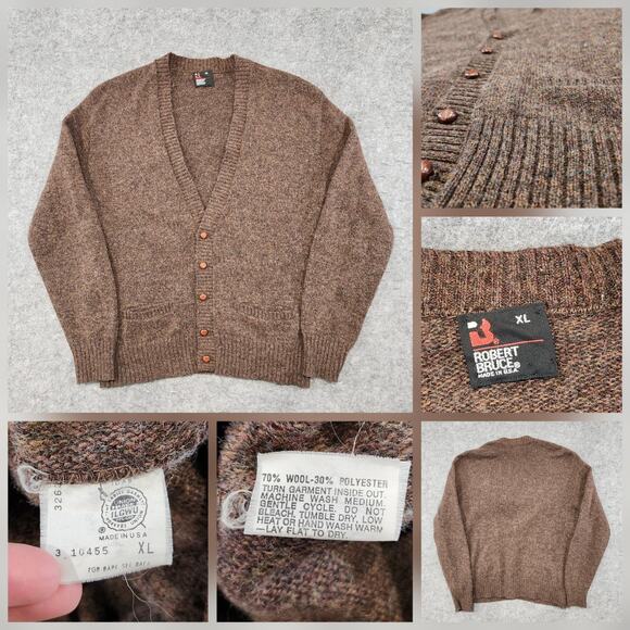 Selling Vintage VTG Robert Bruce Mens XL Wool Knit Brown Preppy Cardigan Sweater USA Union Made. You can see the condition from the photos. You can get further information from looking at what is shown in the photos. Pricing low to sell fast. I offer combined shipping on multiple purchases. All purchases should arrive within 2 to 9 days. International buyers should expect longer shipping time. If there are any issues please do the right thing and message me before leaving feedback.