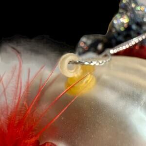 The VTG Robert Stanley Anthropomorphic Blown Glass Pug Dog Christmas Ornament is a small, vintage decoration perfect for the holiday season. Handmade and featuring a unique anthropomorphic design, this ornament depicts a glamorous pug dog and is adorned with sequin beads, hand-painted details, and embellishments like glitter, lace and feathers. The blown glass material and hanging feature make it a charming addition to any Christmas tree, adding a touch of whimsy and nostalgia to your seasonal decor.