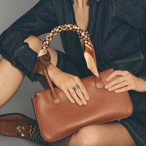 Stylish, made in Japan, 100% nylon square scarf. Size 20x20”. Orange, white, brown. Tiny floral pattern. See last pic for ways to wear suggestion