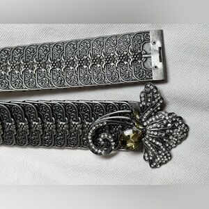 Add a touch of edgy style to your outfit with this vintage rocker biker belt. The metal-accented belt features a floral pattern, rhinestone accents, and a hook buckle that adds a unique touch to your ensemble. The belt is made of nylon stretch material and metal, and it has a stretch of up to 34 inches, 1.75 wide with 3’ buckle making it suitable for waist sizes of 32-34 inches.