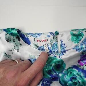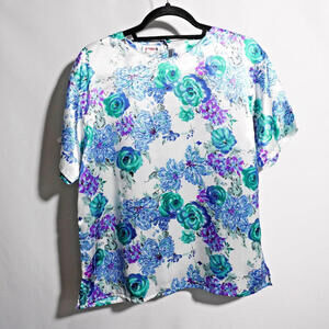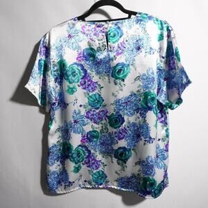 VTG Rodier 100% Silk Satin Floral Blouse Top Flowers Teal Blue Purple Modest L womens large short sleeve vintage retro classic garden luxurious breathable 80s