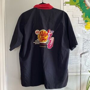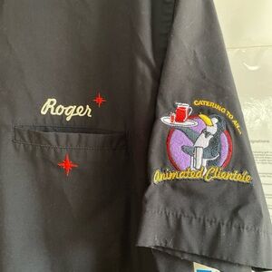 Vintage Disneyland Resort Jessica & Roger Rabbit “Patty Cake Lounge” retro style bowling shirt in black with red with embroidered patches on the back and sleeves. Men’s size M, approx 22” PTP.