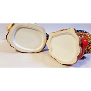 The VTG. Rooster Sugar & Creamer Pitcher is a handpainted ceramic piece with an all-over multicolor pattern, perfect for a farmhouse or granny core style decor. This rustic creamer pitcher features a charming bird theme, making it an original addition to any table setting. The glossy finish and art pottery production style add to its vintage appeal, making it a unique and decorative piece for your kitchen.