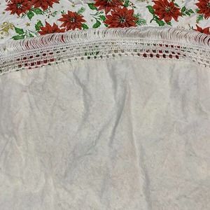 Vintage round 49” CHRISTMAS Poinsettia Bells Tablecloth. Vinyl with Flannel Back. White string edges. 49" without fringe detail. Gorgeous poinsettia and bells design throughout. The vinyl top makes it easy to wipe down and clean quickly.