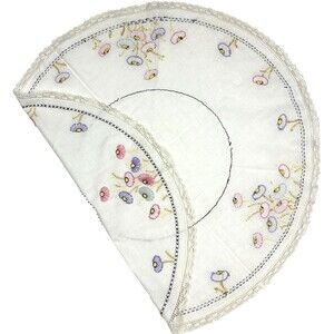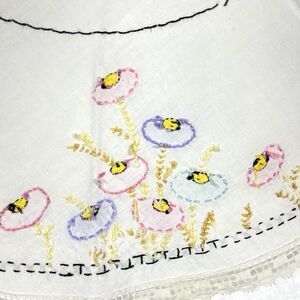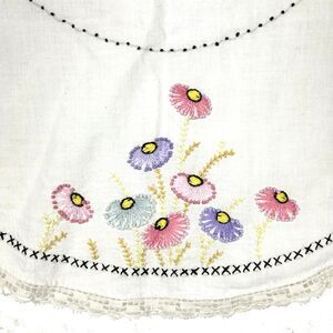 VTG Round Linen Tablecloth embroidered Flowers Cottage Core 33.5in x 31in