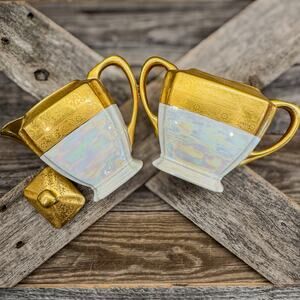 VTG. Royal Bavaria White Luster-Floral Embossed Gold Teapot/ Creamer/Sugar Dish