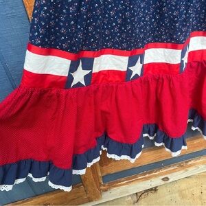 Vintage Ruffled Tiered Prairie Skirt. Navy Calico floral with Red Texas stars and White eyelet lace trim. Elastic waist and pockets at sides. Prairie, Gunne Sax, Rodeo, Line Dancing 70s 80s retro style. Cranston calico floral fabric.