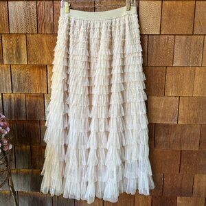 In Excellent, Lightly Worn Condition! Latte Tan Ruffled Tulle Midi Skirt with Elastic Waist in Women's Large - Gorgeous vintage style midi skirt features tiered tulle ruffles, perfect for so many adventures - Date Night, Girls Night Out, Concerts, and Treat Yourself Weekends!