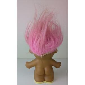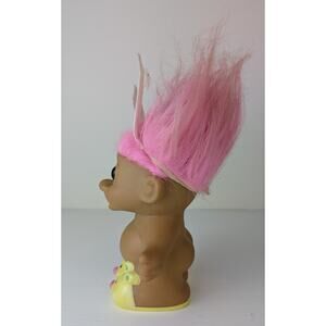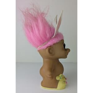 This adorable 5" Easter girl troll features a nude rubber body, brown eyes and pink hair. She is wearing molded yellow bunny slippers and pink & white bunny ears. Great vintage condition!