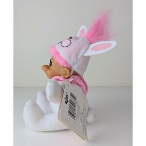 This adorable 5.5" Easter Bunny seated troll features pink hair, a stuffed body, rubber head and brown eyes. She is dressed in white & pink footie pajamas and a cute bunny ear cap. Excellent vintage condition!