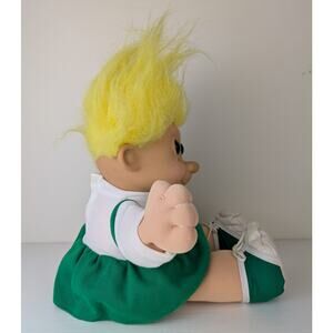 This cute 12" Troll Kidz soft body cheerleader cheerleading doll is dressed in a green and white removable cheer costume with a matching yarn pom pom. She has yellow blonde hair and blue eyes. Excellent vintage condition with only a little bit of discoloration on her shoes.