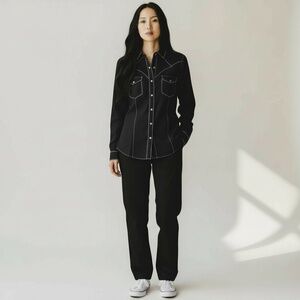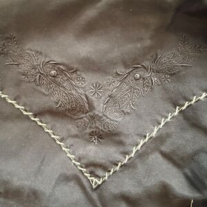 This is an amazing VTG Ryan Michael Western Long Sleeve Shirt. This Western-style shirt is black silk blend with contrast white stitching/piping, pearl snap buttons, western Yokes and embroidery on the yokes, back and sleeves. I absolutely love this shirt but unfortunately it is too small for me. This is in very good, pre-owned condition.