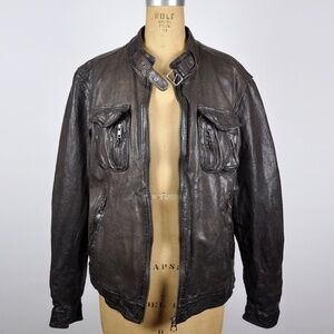 Beautiful, sturdy chocolate brown distressed leather with bronze/pewter colored zippers and hardware. Factory distressing gives it that perfect broken-in vibe.