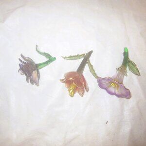1- PURPLE & CLEAR MORNING GLORY W/LEAF, GOLD ACCENTS 3'' LONG 2'' X 2'' 1 LEAF BROKEN OFF