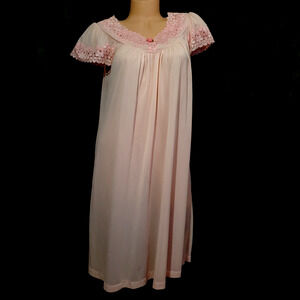 VTG SHADOWLINE Nightgown FEMININE PINK NYLON Sissy Coquette Eyelet Lace SMALL