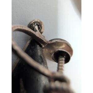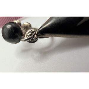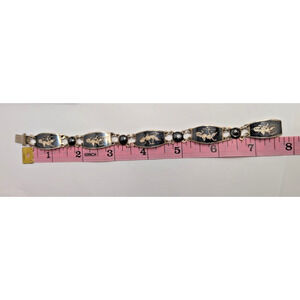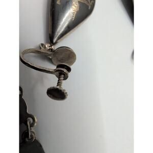 The vintage SIAM Sterling Silver Dancers Set includes a bracelet and screwback earrings plus one additional clip earring, all made of black enamel on sterling silver. The vintage jewelry set is from the Retro era (1935-1950) and is signed by the brand Siam, indicating its authenticity. The materials are sourced from Thailand, adding a unique touch to the fine jewelry pieces. With a metal purity of 925 sterling silver, this set is a stunning addition to any jewelry collection.