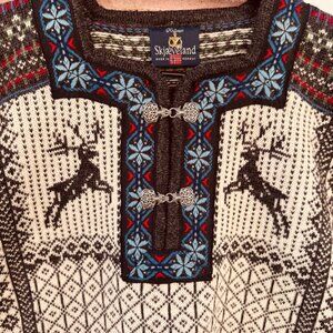 This Norwegian wool sweater combines traditional craftsmanship with timeless design, featuring intricate patterns, pewter clasps, and a reindeer motif. Warm and durable.