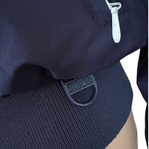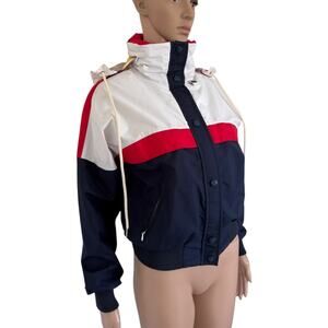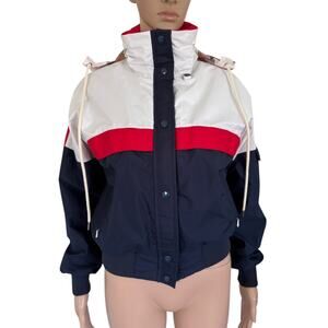 Vintage women’s SKYR Gore-Tex color-block windbreaker in navy, red, and white. Lightweight waterproof shell made with authentic Gore-Tex fabric for wind and rain protection. Features a full zip with snap placket, high collar, adjustable drawstring hood, ribbed hem and cuffs, and two zip front pockets. Classic late-80s / early-90s sporty style made in Hong Kong. The jacket has a slightly cropped fit and retro ski-inspired design—perfect for hiking, camping, or adding a vintage outdoor vibe to everyday looks. One small area of yellowing inside the hood (shown in photos). Lining is soft and fully intact.