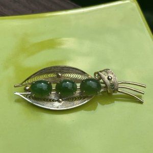 • Beautiful Vintage Italian Designer “Sorrento Sterling” Signed Gold Vermeil over Silver Filigree Leaf Brooch with 3 Jade Like Cabochon Stones