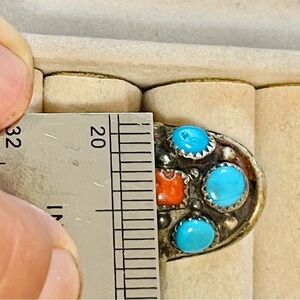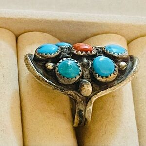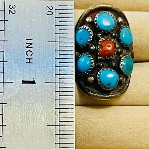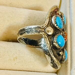 VTG SOUTHWEST Navajo Ring 925 St.Silver Blue Turquiose & Coral Signed VB Sz 6