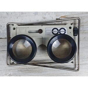 Vintage SRPI Morin stereoscope viewer made in France. Precision optical instrument used for viewing aerial photographs and topographic maps in 3D, commonly employed by cartographers and surveyors. Features adjustable focus and sturdy metal wire frame. Comes with the original black leather case. Excellent optical clarity and solid design. In very good condition. See pics for details.