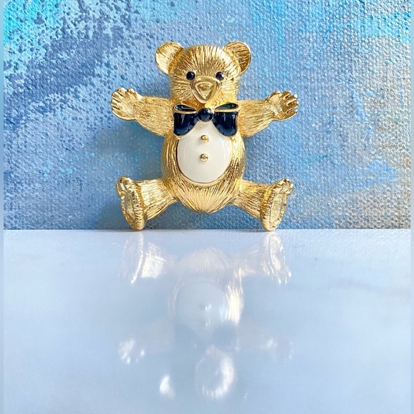 This Rare and Charming St. John gold teddy bear brooch featuring an enamel belly and black bow. Perfect for adding a playful touch to your outfit.