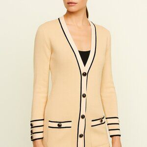 Chic cream cardigan with striking black trim. Ideal for layering. Made with Santana knit. Ideal for church and other events.