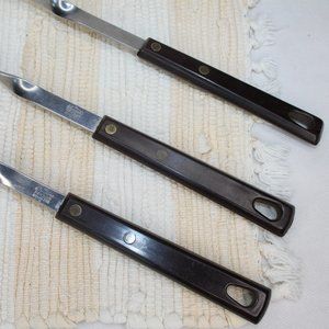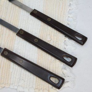 This 3 piece set is all stainless with twisted shafts attached to Brown Nylon handle. 2 brass rivets. Hole in handle for hanging.
