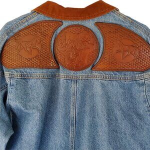 VTG SUNBELT Western Denim Duster Coat Women's M/L Tooled Leather Button Pockets