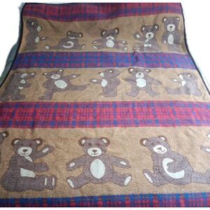 VTG San Marcos Blanket 56x86 Teddy Bear Animal Plaid Brown Red Blue Cottagecore