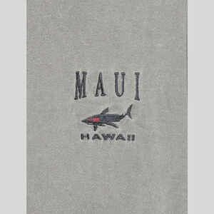 Cool vintage gray t-shirt. 100% pre-shrunk cotton, single stitch. Shark embroidery with "Maui, Hawaii" embroidered on the chest.