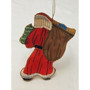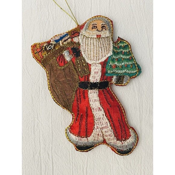 Vintage Santa Christmas Ornament Handmade Fabric Silk Figurine with Needlecraft and Gold Thread 5.25 Holiday Decoration