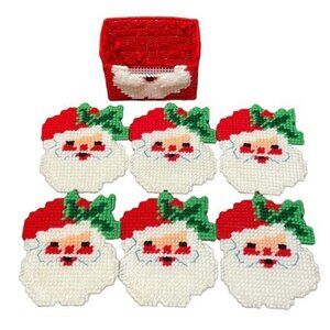 VTG Santa Claus Handmade Plastic Canvas Coasters Napkin Rings Set of 6