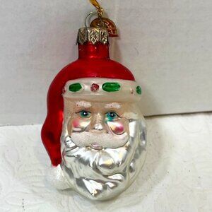 Features: Santa w/silver beard, glittery white mustache & eyebrows, blue eyes, red Santa hat w/glittery white pom pom & green, red decorations on trim