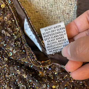 Introducing a stunning vintage Scala silk blouse, perfect for any occasion. This collarless top features a unique V-neckline and flutter sleeves, with a pullover closure for easy wear. The blouse is accented with beautiful beaded details and a stunning sequin pattern, adding a touch of whimsy and elegance to any outfit.