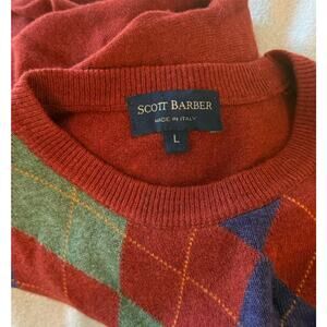 The Scott Barber Wool Sweater in size Men's LG is a classic and preppy piece with a brick red argyle/diamond pattern, perfect for various occasions such as travel, casual, workwear, or business. Made with high-quality materials like cashmere, merino wool, and polyamide, this tight-knit sweater features a crew neck and long sleeves, making it a stylish and versatile choice for the winter, fall, or spring seasons. With its vintage appeal and designer brand, this pullover sweater is a timeless addition to any man's wardrobe, especially for those who appreciate golf and classic fashion.