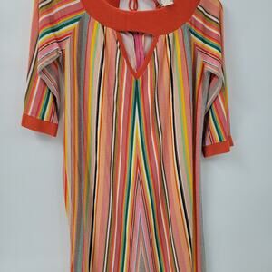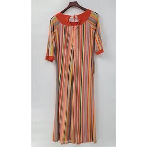 VTG Sears 70s Multicolor Striped House Coat Small Orange Robe Keyhole Back