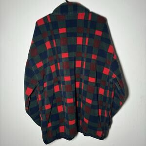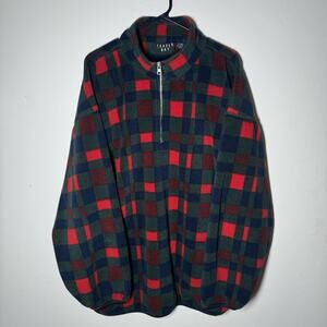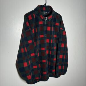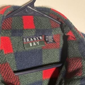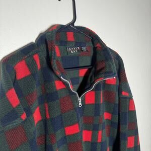 VTG Sears Trader Bay Men’s Large Red Green Plaid Fleece Jacket 1/4 Zip