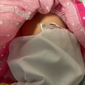 This beautiful little girl is a RARE beauty with her hard to find pretty gray eyes and brown poodle double ponies. She has Hong Kong (although faded) on the back of her head and KT Factory on her tag so she is a single Hong Kong. She has a green undated signature-SECOND EDITION. She is wearing a BRAND NEW very pretty handmade dress and bloomers. She is also wearing a NEW diaper, pretty lace socks, and CPK shoes. She has a real Coleco brand pacifier not a replacement (although I do love those too.) She comes with EVERYTHING she needs with the exception of YOU!!! She is in very good vintage condition for her age of 42-soon to be 43 but please bear in mind that she is still a vintage item-not new and therefore not perfect but definitely restored. Just look at her standing all by herself!! Please see all pics as they are part of the description. She comes from a smoke free home. Sold AS IS.