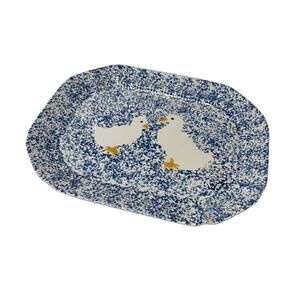 Vintage ceramic spongeware platter featuring two white ducks with golden feet on a bold cobalt blue stipple background. This 16" collectible piece is a rare example of the beloved stippled sponge-painted ceramic style—likely made in Japan. An ideal serving tray or display piece for cottagecore lovers, farmhouse kitchens, and vintage collectors. Use it for Easter brunch, spring and summer gatherings, Thanksgiving feasts, or cozy holiday dinners. Clean with no cracks or chips. Measures approx. 16"L x 13"W x 2"H.