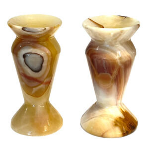 Vintage Set (2) Marble Onyx Stone CANDLE HOLDERS Natural Marbled Brown & Cream Design For Taper Candlesticks - Excellent Condition!