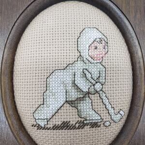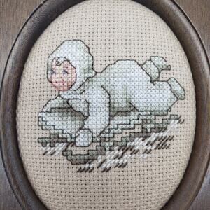 VTG‎ Set OF 2 Unique Shaped Wood Framed Handmade Cross Stitch Snow Babies