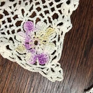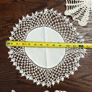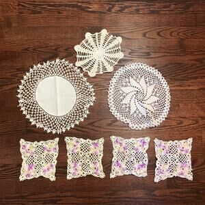 This great set of 7 doilies are great for a shabby chic decor. There are 4 square ones in white with purple and some yellow colors mixed in, and there are 3 circular ones in all white. Feels like cotton material. Overall good used condition. See pictures for details and measurements.