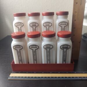 VTG Set Of 8 Original Griffiths Spice Jars ~ Milk Glass With Red Metal Rack