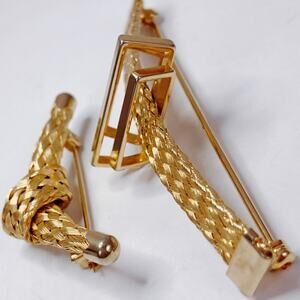 Features: Two-piece brooch set; woven mesh metal design; one knot motif brooch; one geometric bar brooch with open rectangular centerpiece; textured braided finish; gold tone end caps and fittings; secure pin clasps