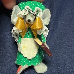Mouse w/green & white polka dots outfit, whiskers, gold bow under chin, holding a book, Made w/wooden clothes clip
