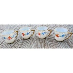 VTG Set of 4 Iridescent French Milk Glass Teacups Gold Trim Hand Painted Floral