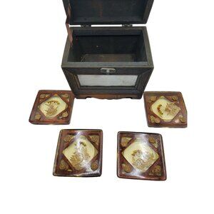 Set of 4 vintage lucite floral coasters with a stylish wooden storage box. Perfect for adding a touch of retro charm to your home decor or as a unique gift.